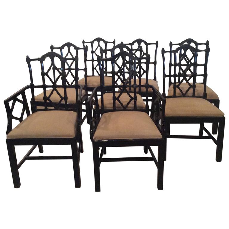 Amazing black lacquered, vintage set of ten fret work dining chairs, eight side and two armchairs. This is the original lacquered finish however it is good condition with a few minor chips. These are made in Spain and are marked underneath.