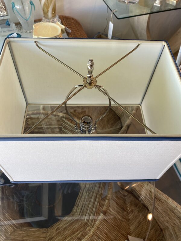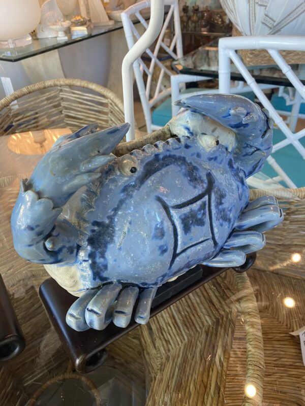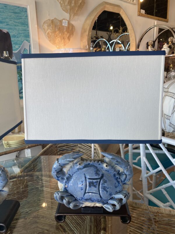 Outstanding vintage pair of large terra-cotta blue crab table lamps sitting on top of ming wood scroll bases. No chips or breaks. Newly wired, 3 way sockets. New nickel hardware. Lampshades are original so they do have some yellowing on the interior. Lamps measure: 25.5 H to top of the finial x 17 H to top of lamp socket x 12 W x 6 D. Shades measure: 9 H x 13.5 W x 9.25 D.