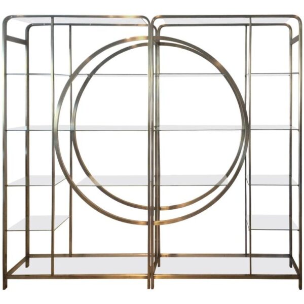 Amazing pair of vintage brushed brass etageres by ‘DIA’ Design Institute of America by Milo Baughman. Tagged Design Institute of America, pictured. Nine glass shelves per etagere. These can also be separated to make single separate etageres. Some small scuffs/patina to side, pictured. Overall in very good condition. Each etagere measures 42 wide x 16 D x 78 T. Together they are 84 wide, as pictured.