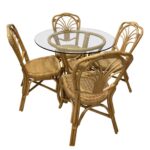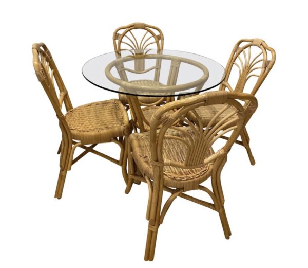Vintage 5 piece rattan and wicker dining set. Includes 4 chairs and table base. Glass pictured is not included as it is used.
