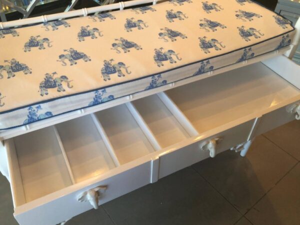 The most amazing custom, changing table! Newly lacquered in a white gloss finish, drawer with dividers, ceramic elephant drawer knobs, all new changing table pad with Lilly Pulitzer blue elephant fabric and matching blue piping. Changing table pad is new foam covered in a stationary waterproof cover. The Lilly Pulitzer changing table cover has a zipper so it can be removed for washing purposes.