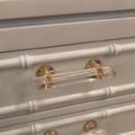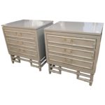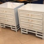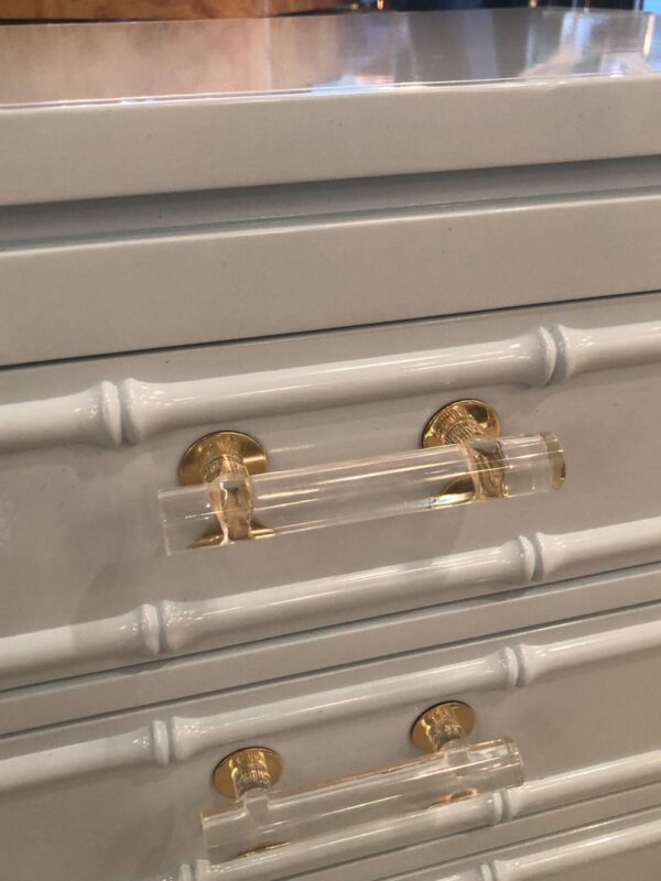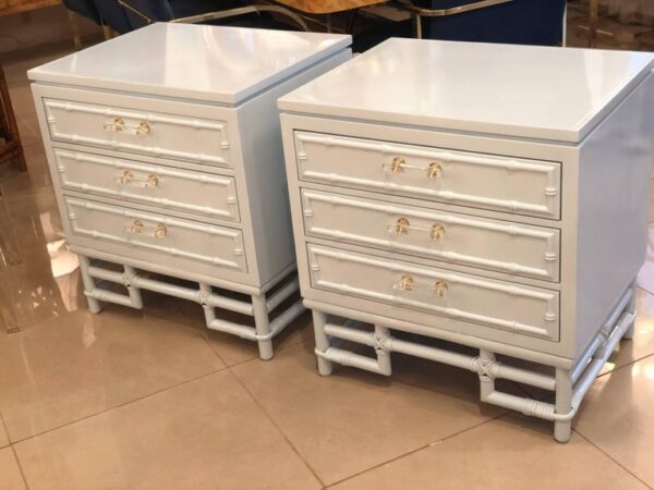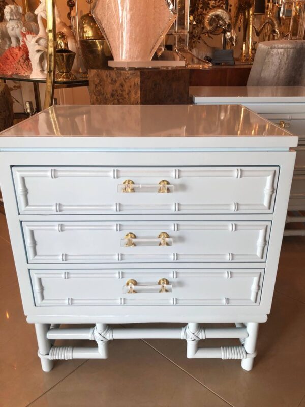 SOLD Faux Bamboo, Rattan Lucite & Brass Nightstands Chest Pair Lacquered Powder Blue