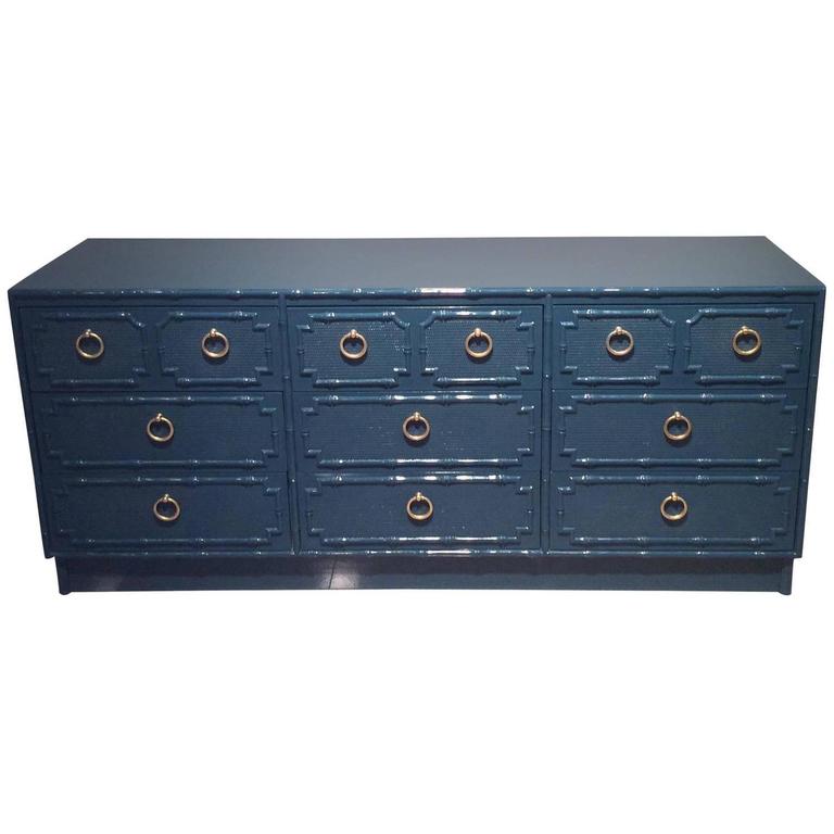Amazing vintage faux bamboo nine-drawer dresser newly lacquered in a teal peacock blue with lovely polished brass ring hardware.