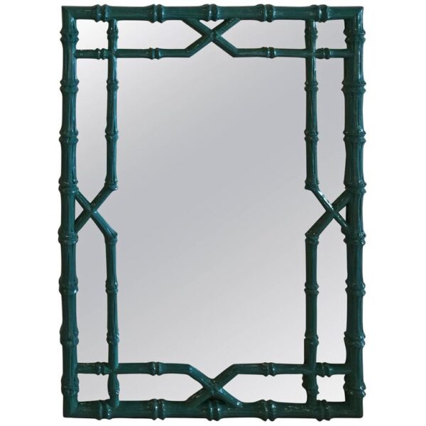 SOLD Faux Bamboo Wall Mirror Vintage Newly Lacquered Chinese Chippendale Teal Blue