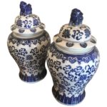 SOLD Foo Dogs Blue and White Ginger Jars Pair Vintage Large Urns Palm Beach Oriental