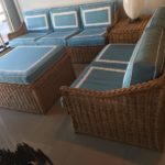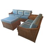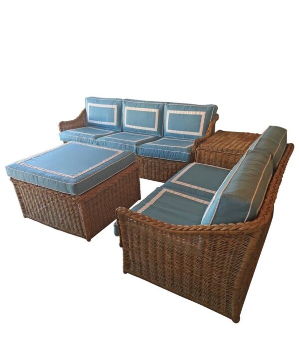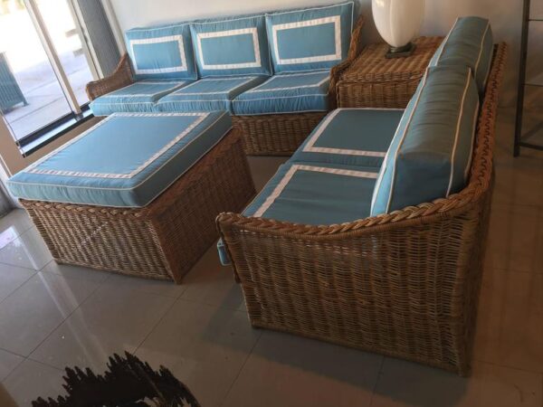 SOLD Four Piece Woven Rattan Wicker Patio Sunroom Set Sofa Loveseat Ottoman End Table