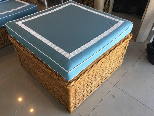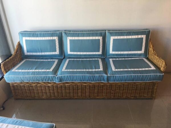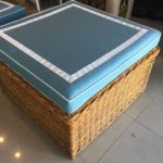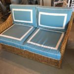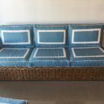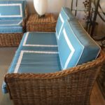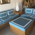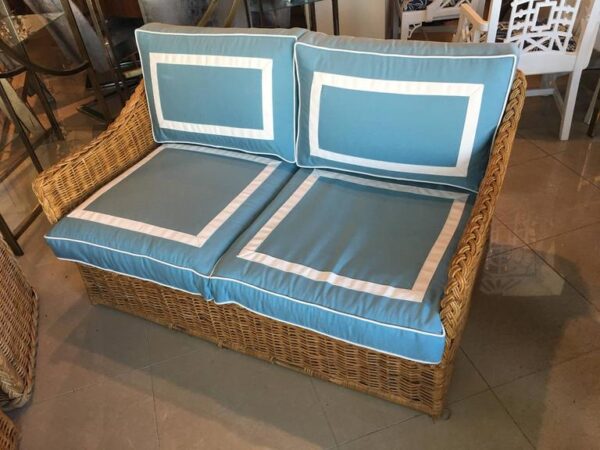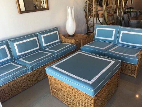 Amazing 4 piece vintage woven rattan, wicker, bamboo patio, porch, Sunroom, lanai, outdoor set. This has been newly, custom upholstered with outdoor/indoor Sunbrella fabric. The cushions are zippered and reversible with pattern on both sides! Set includes sofa, loveseat, end table, ottoman (coffee table), the cushion is removeable. Wicker top underneath. Amazing set!