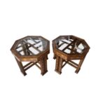 Vintage pair of wood, Chinese Chippendale fretwork, octagonal side end tables with glass tops. Original wood finish. Original vintage glass may have scratches but no breaks. Dimensions: 24 W x 24 D x 21.5 H.