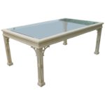 Split leg dining table. Fretwork on the skirt of the table, split fret legs, fret corners underneath a glass top. Original finish which may have scuffs and scratched to the paint. This can be professionally lacquered in color of choice for an additional cost. Email me if interested.