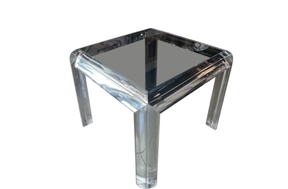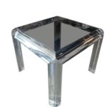 Vintage chunky 4″ thick lucite game table, dining table. Waterfall edges, smoked glass top. If you would like regular glass I can change it out for regular glass for an additional $175. The smoked glass is original and may have a few minor scratches. The lucite has been polished. Dimensions: 36 W X 36 D x 28.5 H.
