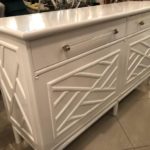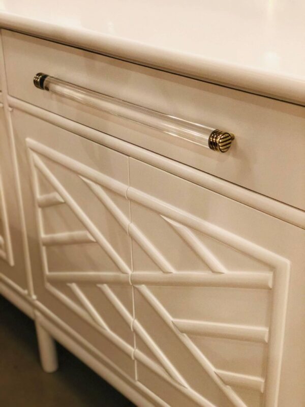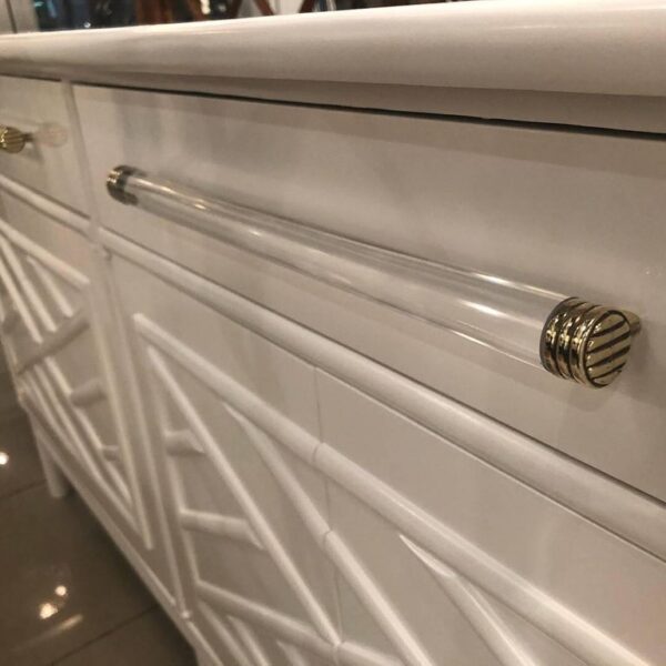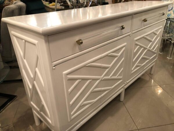 Amazing vintage newly lacquered white Credenza, Buffet, Sideboard. Rattan, Faux Bamboo Chinese Chippendale details. Oversized Lucite and brass hardware. There are two drawers on top and the doors open to reveal a shelf on each side. Lacquered inside the cabinet and drawers as well.