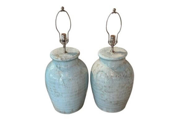 Vintage large pair of terra cotta glazed crackle porcelain finish in a beautiful soft light minty green color. No chips or breaks. These have been newly wired with clear cords, 3 way sockets, all new nickel hardware. Dimensions: 29 H to top of finial x 22.5 H to top of socket x 13 D.