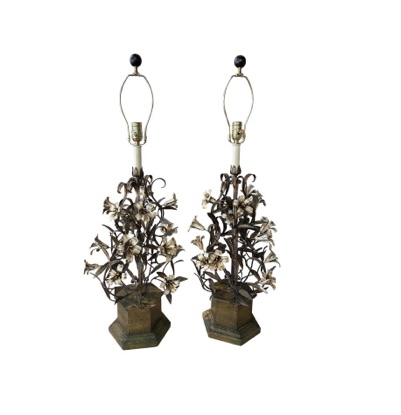 Vintage 1940s tole floral flowers Lily Lillies table lamps, tagged Made in Italy. These have been newly wired, new brass 3 way sockets, harp, clear cord. Thes have all their wonderful chippy patina. Dimensions: 38 H to top of finial, 29 H to top of lamp socket x 14 D.