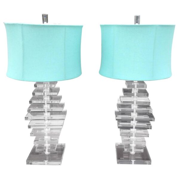 SOLD Lucite Pair of Stacked Table Lamps Finial Lampshades Architectural