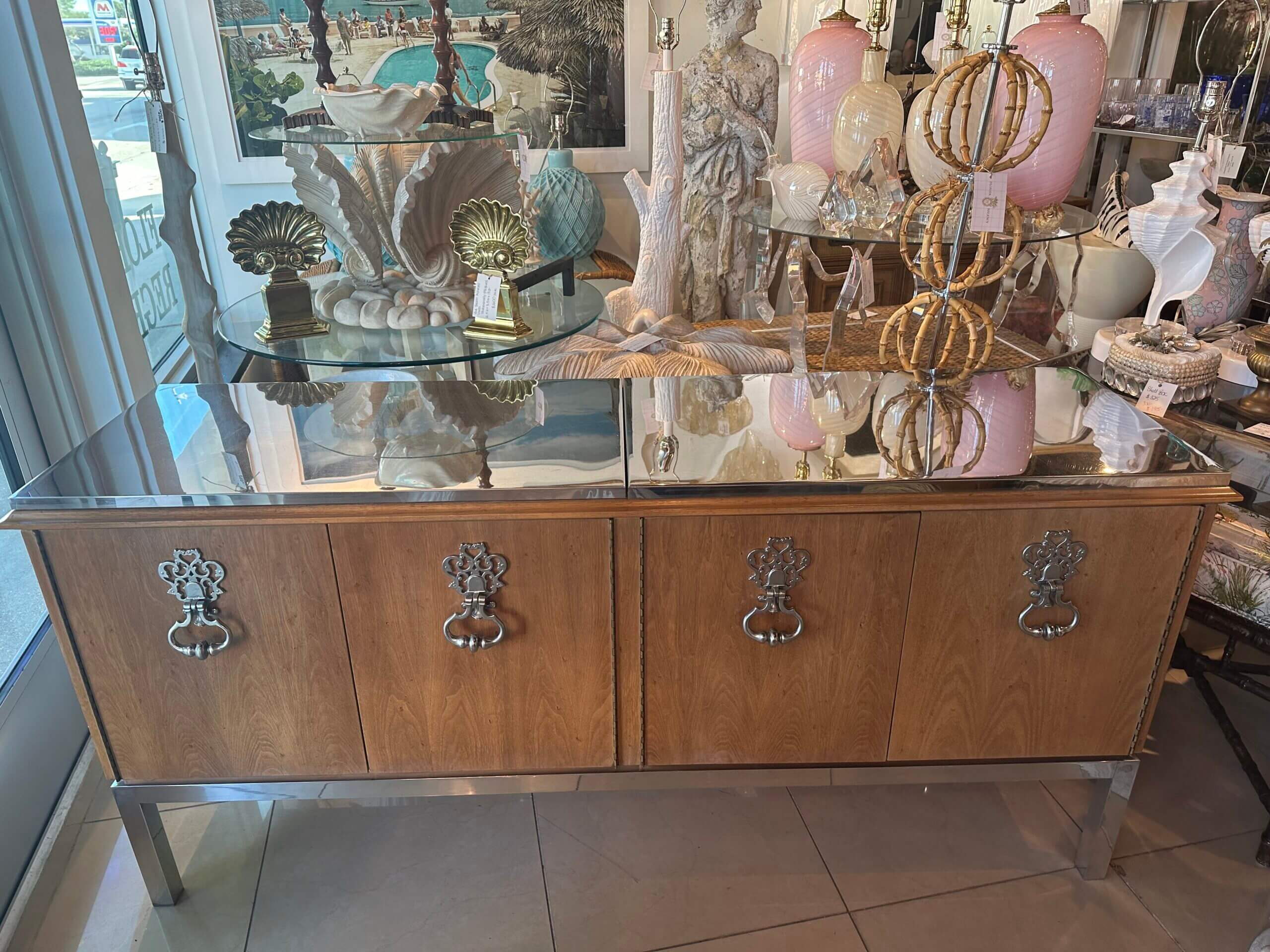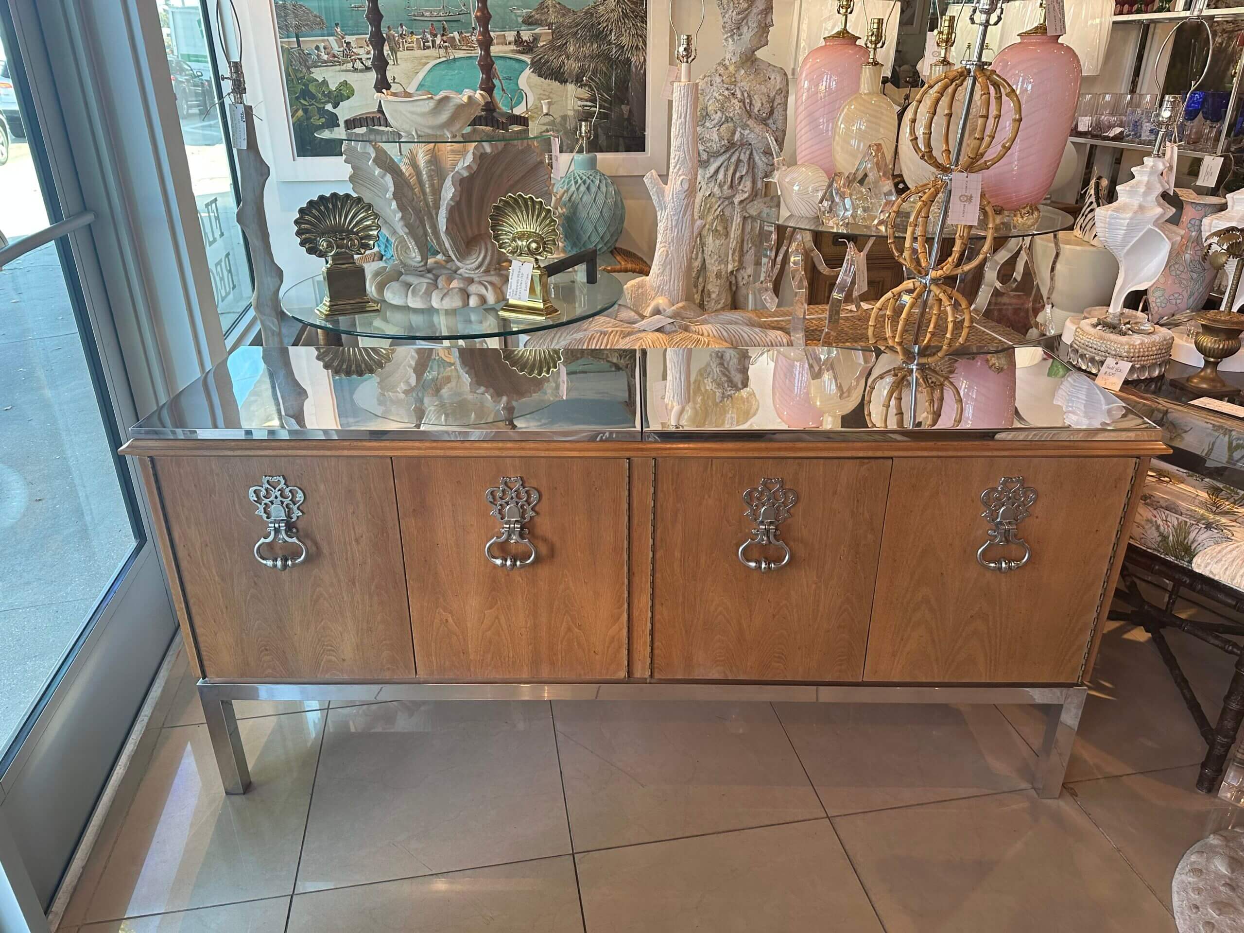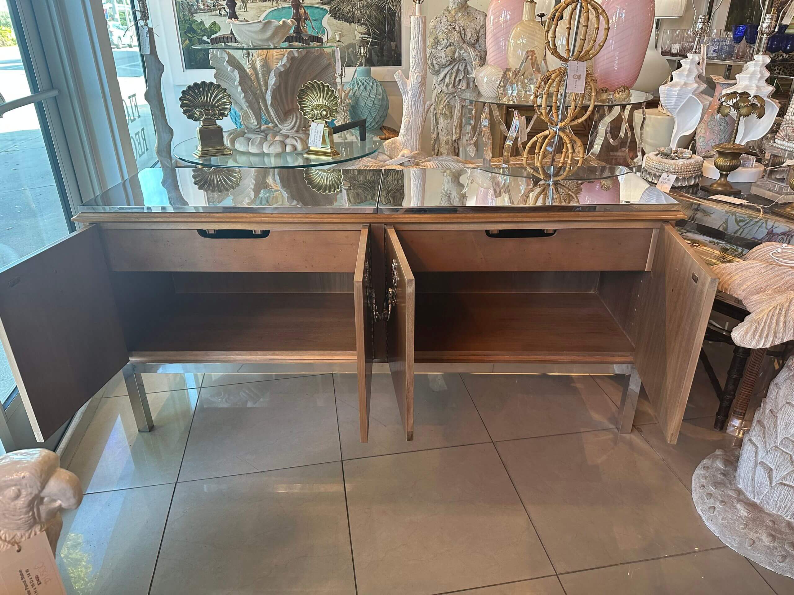 Vintage 1975 Mastercraft credenza cabinet buffet sideboard. Limited, custom made by Mastercraft. in the style of Tommy Parzinger. I believe the wood is Mahogany. 4 doors with 2 drawers and shelves inside. All original. All metal is cleaned and hand polished. The base is aluminum. Chrome top & door style knockers for handles. There is a few minor “dimples” on the metal top and surface scratches that can be seen when the angle is right with lighting. I tried to picture but it’s hard to show. Happy to send additional close ups if needed. The wood finish is original and may have minor flaws but nothing noticeable. Cabinet has been cleaned and hand polished. Dimensions: 32 H x 18.75 D x 67.5 L.