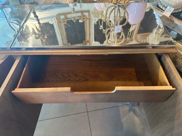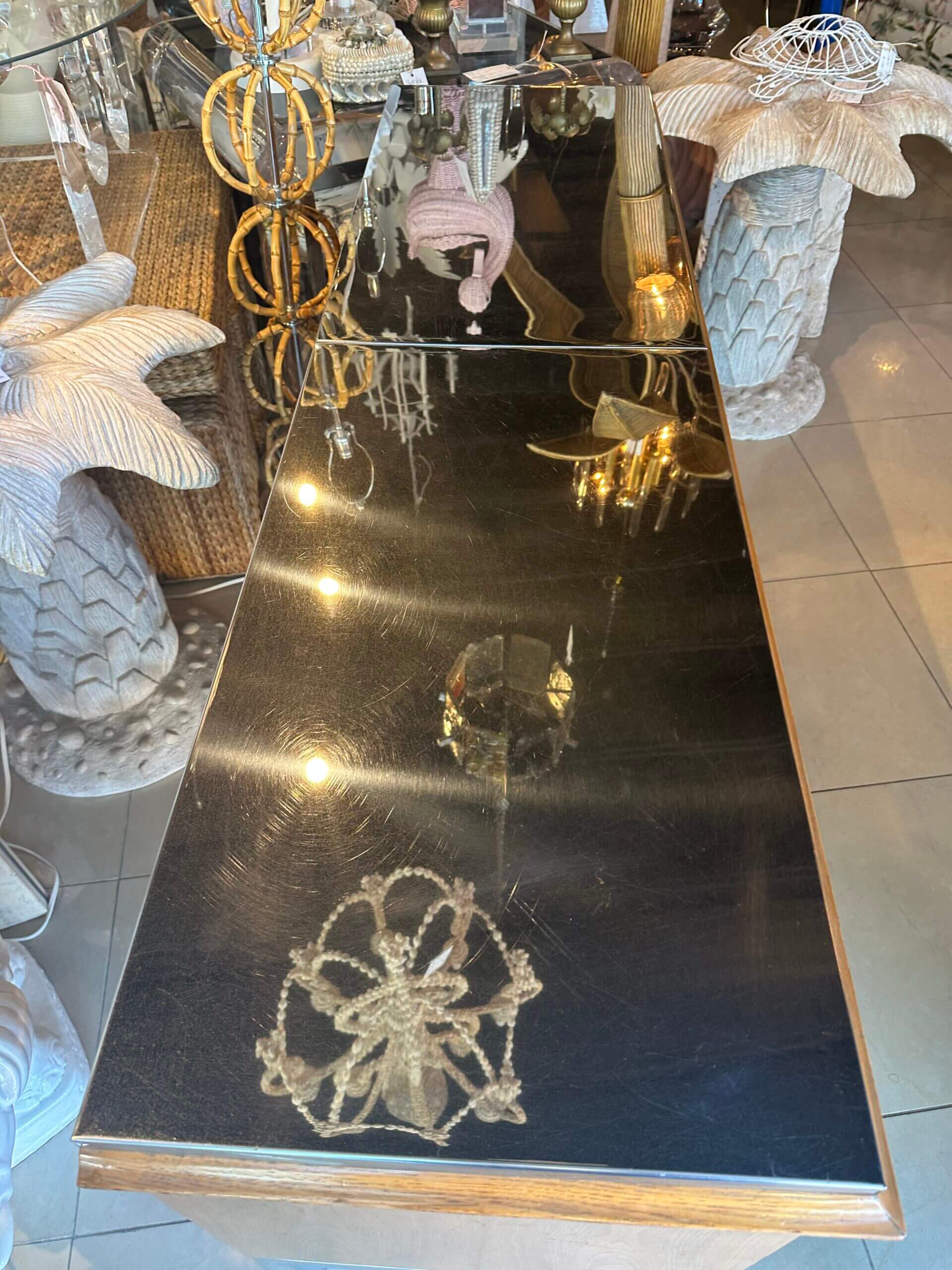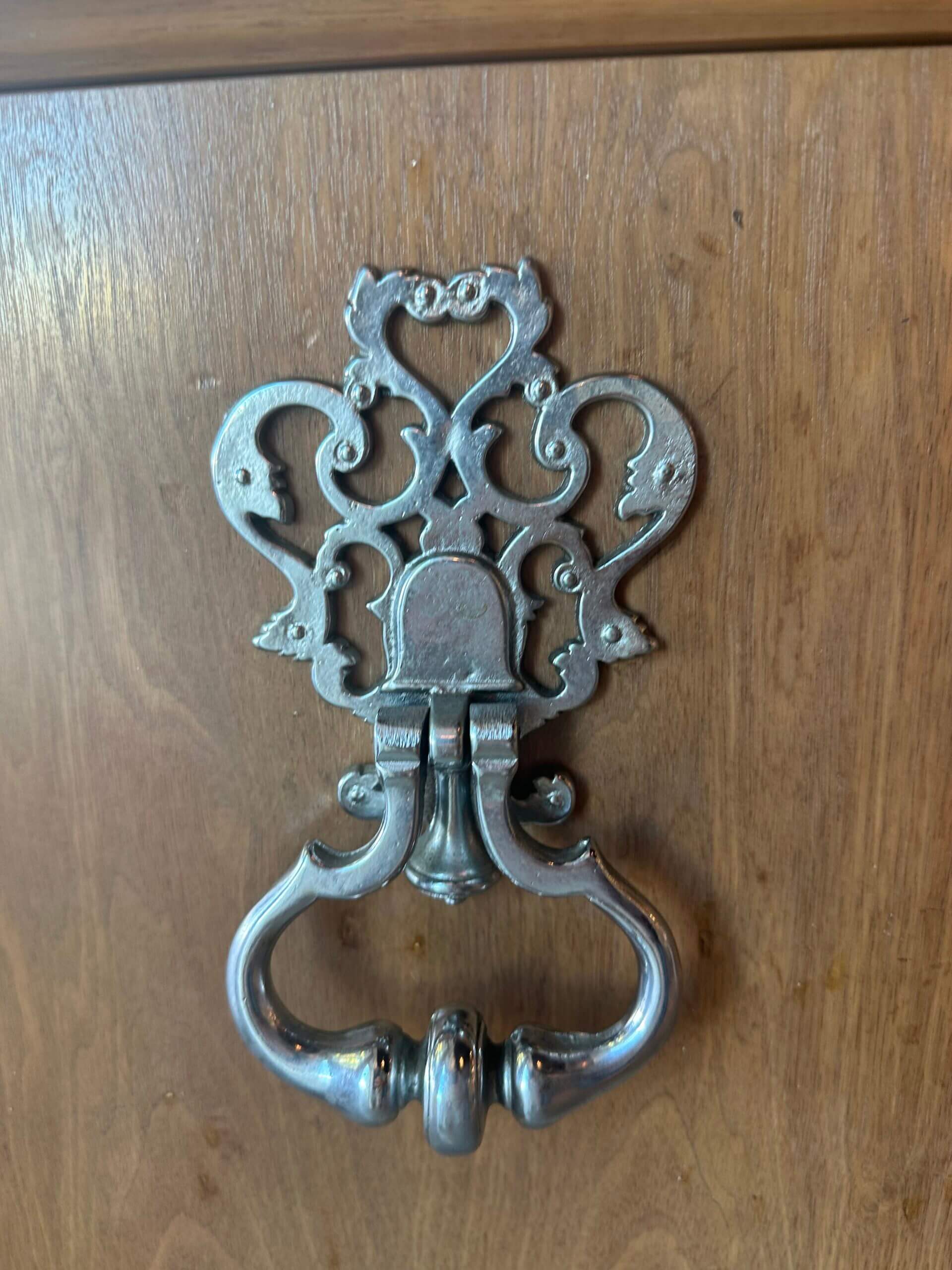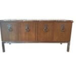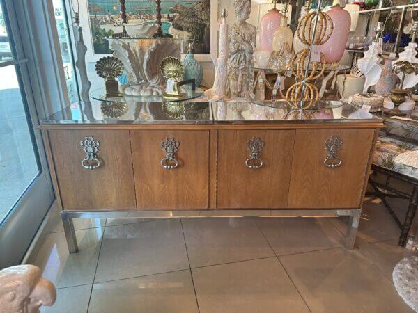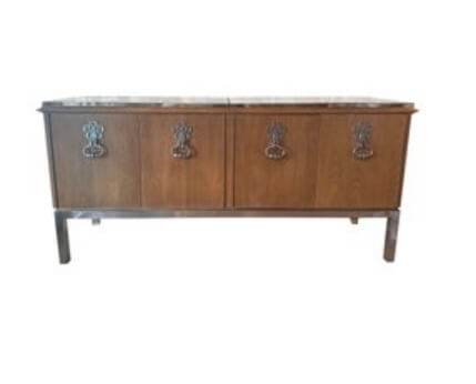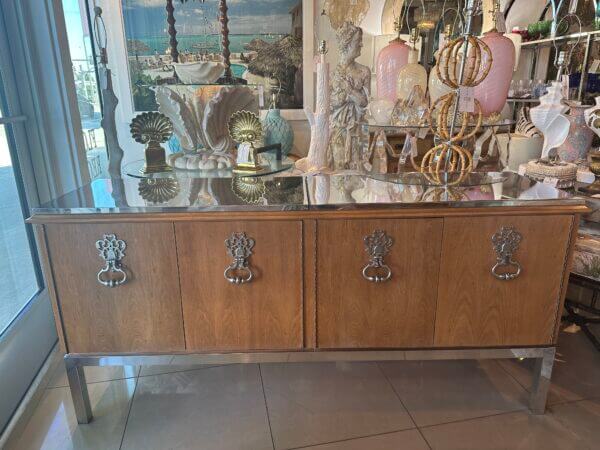 Vintage 1975 Mastercraft credenza cabinet buffet sideboard. Limited, custom made by Mastercraft. in the style of Tommy Parzinger. I believe the wood is Mahogany. 4 doors with 2 drawers and shelves inside. All original. All metal is cleaned and hand polished. The base is aluminum. Chrome top & door style knockers for handles. There is a few minor “dimples” on the metal top and surface scratches that can be seen when the angle is right with lighting. I tried to picture but it’s hard to show. Happy to send additional close ups if needed. The wood finish is original and may have minor flaws but nothing noticeable. Cabinet has been cleaned and hand polished. Dimensions: 32 H x 18.75 D x 67.5 L.