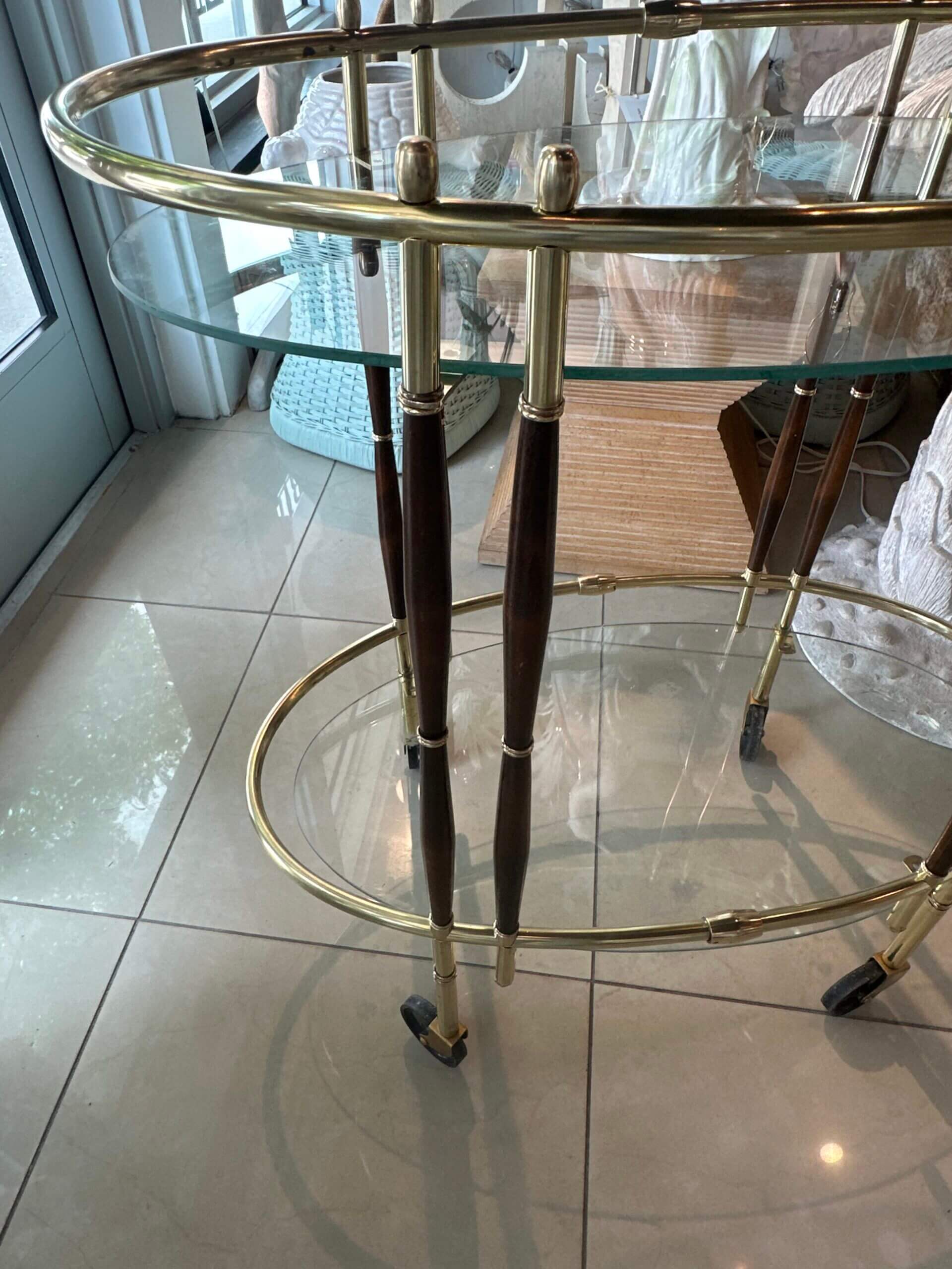 Vintage 1950s Italian oval bar cart with walnut wood and brass, double tier glass shelves. Both top and bottom glass will be new glass. This has been polished but does have normal patina to brass and wood. Dimensions: 33.5 H x 31.5 W x 17 D.