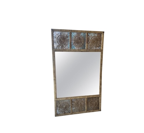 Vintage woven rattan, spun wicker wall mirror. Can be hung vertical or horizontal. Some wear to corner, pictured . Dimensions: 60 H x 36 W x 1.5 D.