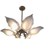 Vintage palm tree frond, leaves and leaf glass chandelier. Six leaves calla lilies. There is patina and tarnishing to the frame of the brass.