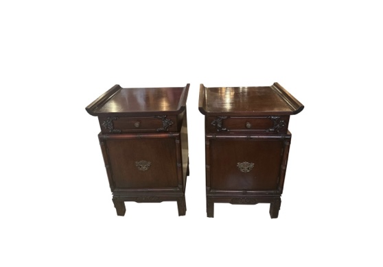 SOLD Vintage Pair of Night Stands Pagoda Faux Bamboo Oriental Altar Mahogany Chinoiserie