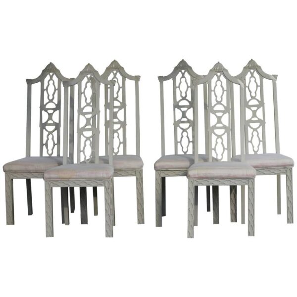 SOLD Pagoda Set Six Fretwork Chinese Chippendale Hollywood Regency Side Dining Chairs