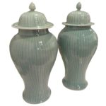SOLD Pair Ginger Jars Mint Green Celedon Faux Bamboo Pattern Hollywood Regency