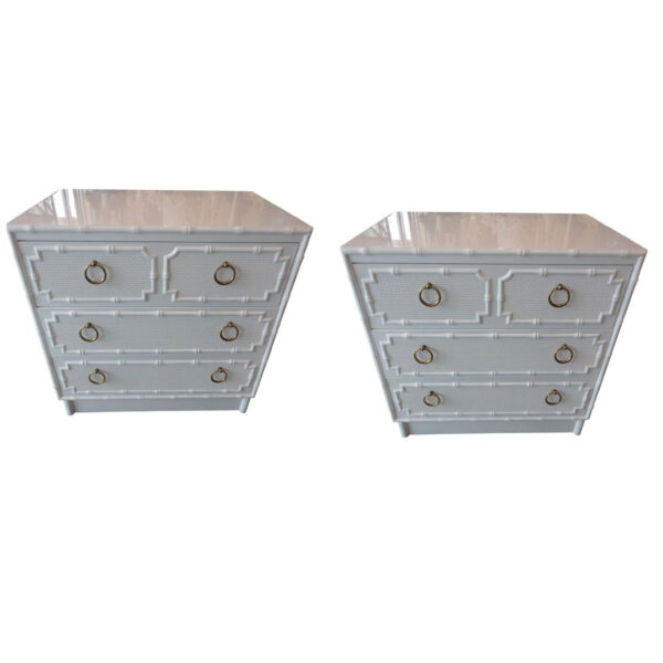 Pair of Vintage Faux Bamboo 3 Drawer Chests. NEWLY lacquered in a gloss white finish with polished brass hardware. There may be minor imperfections to the newly lacquered as is vintage condition.