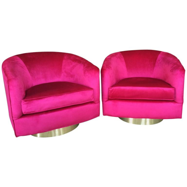 The most amazing vintage Milo Baughman tub, barrel, swivel armchairs, newly upholstered in a hot pink fuchsia velvet fabric with original brass gold platform bases. Great Hollywood Regency chairs! Cushion depth 20.