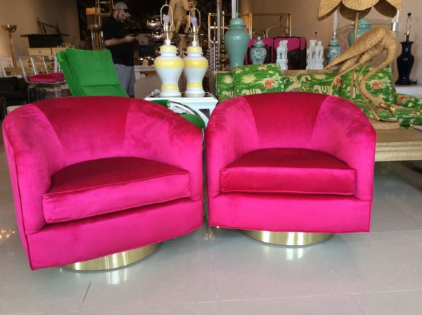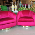 SOLD Pair of Milo Baughman Pink Velvet Brass Swivel Tub Barrel Armchairs Vintage