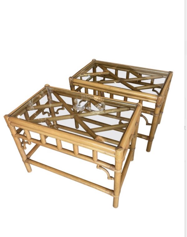 Pair of vintage Chinese Chippendale rattan, glass top end side tables. New glass has been cut for the top. No damage to rattan.
