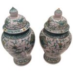 SOLD Pair Vintage Ginger Jar Green Asian Oriental Greek Key Hollywood Regency Japan