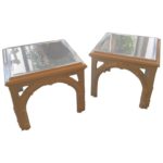 Lovely pair of vintage Serge Roche style end side tables. These have been professionally lacquered in a white gloss finish. There may be minor imperfections to the newly lacquered vintage finish. Perfect for the chinoiserie, Palm Beach decor.These have new glass tops that have been cut. Mirror top will be new glass tops.