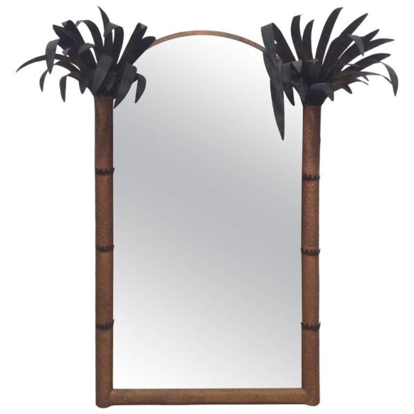 Amazing vintage metal tole, arched wall mirror with palm tree frond sides. Comes ready to hang with wire on back. The sizes below include the Palm leaves.