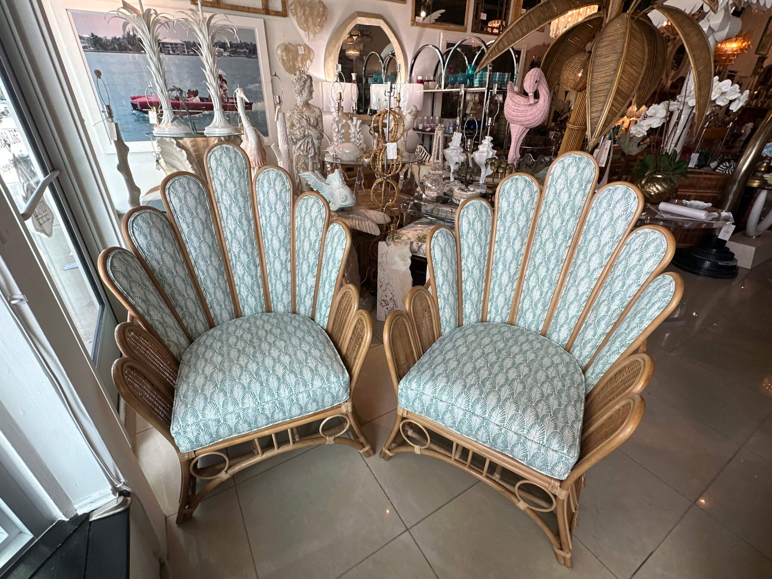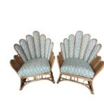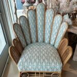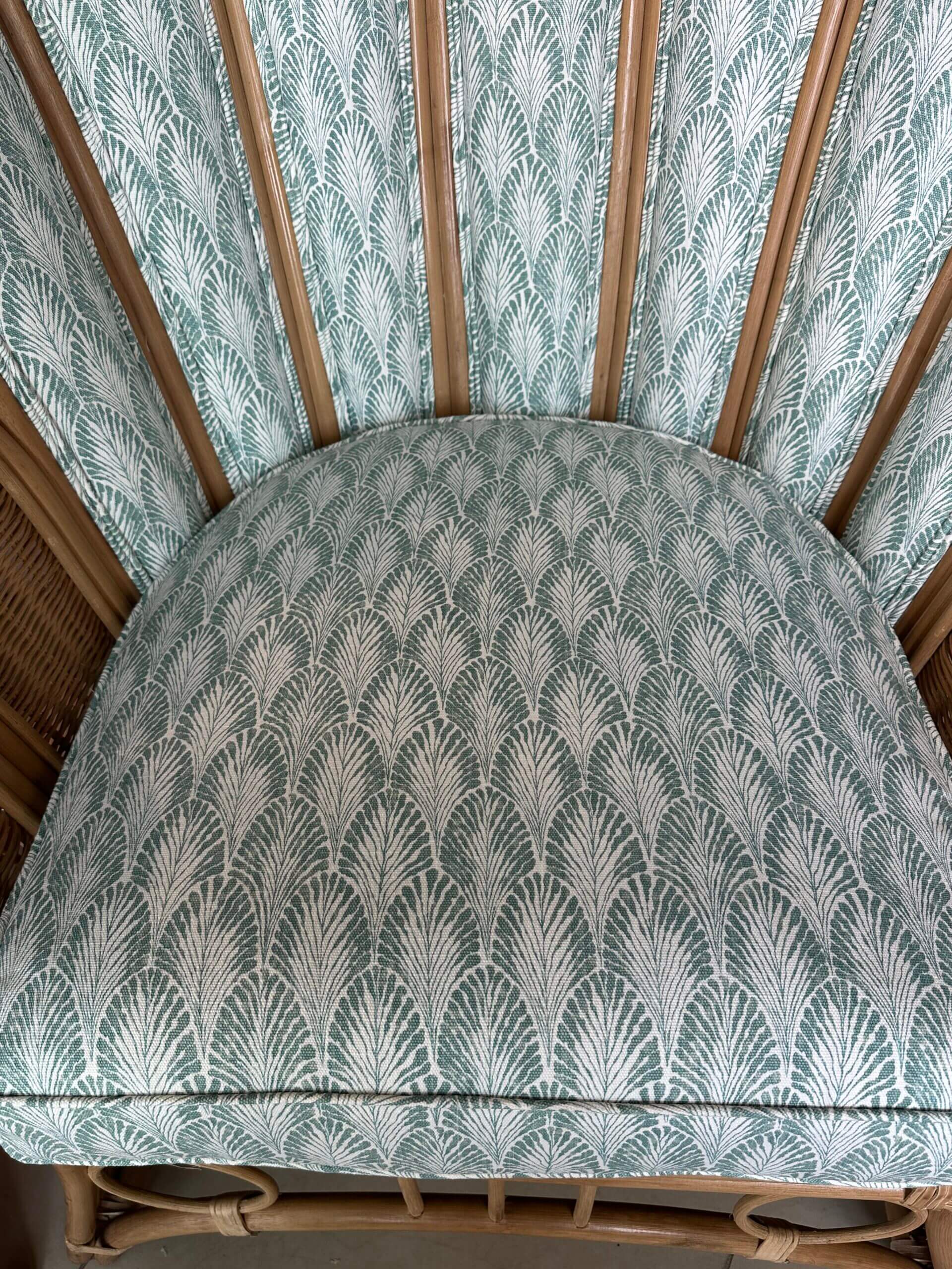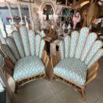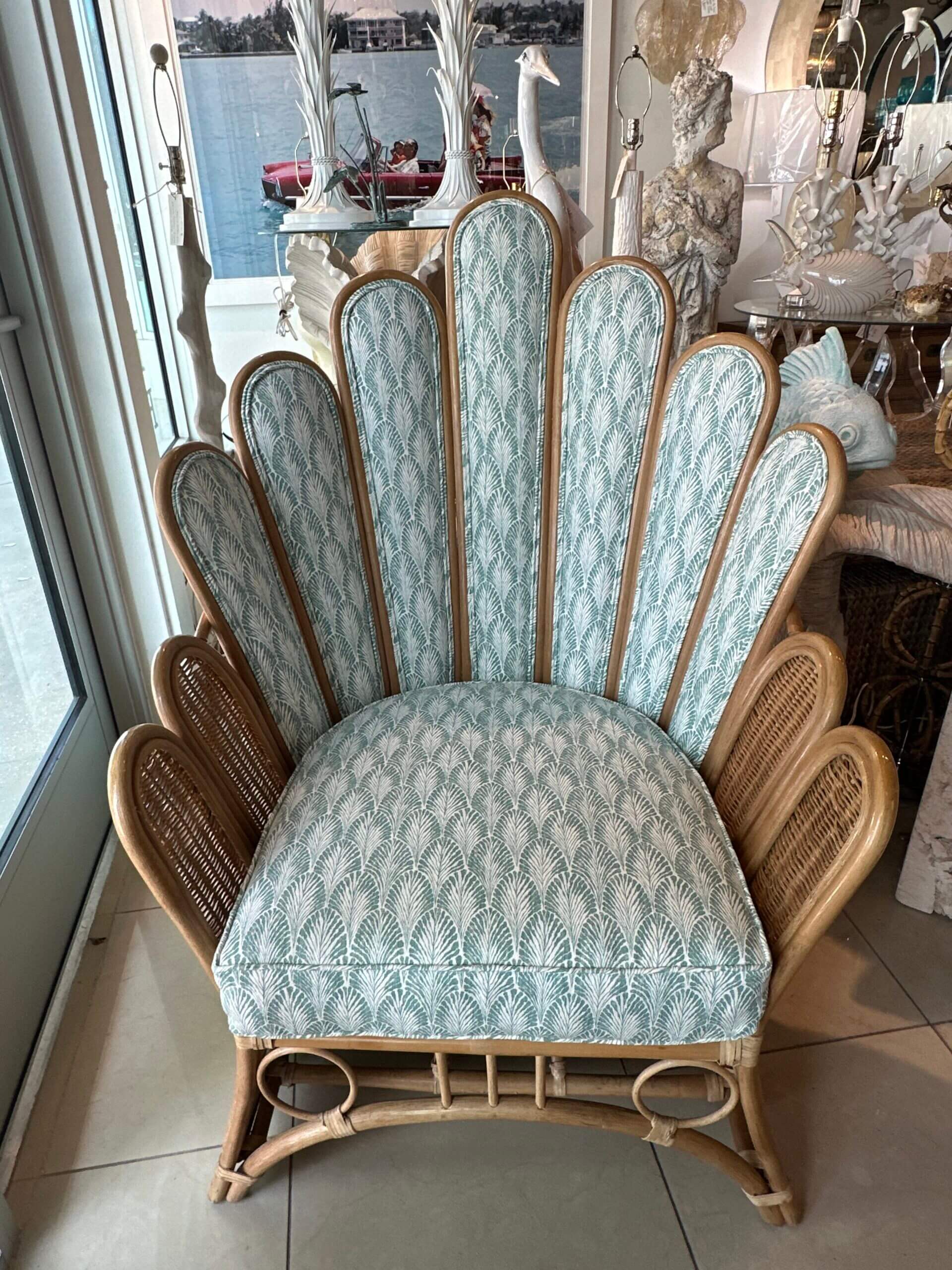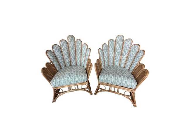 SOLD Vintage Pair of Peacock Fan Back Rattan Wicker Newly Upholstered Chairs