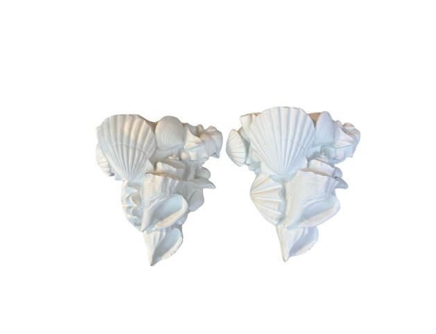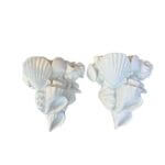 Vintage pair of shell seashell wall sconce shelves. Newly finished in a flat plaster white. Comes ready to hang. Made of a lighter weight composite. Dimensions: 14 H x 13 W x 6 D.