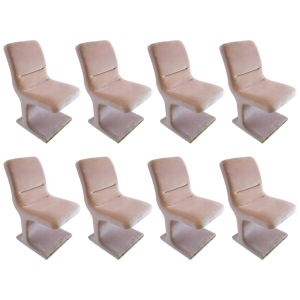 One of my all time favorite sets of dining chairs! Set of eight lovely pink velvet side dining chairs. The shape is nothing short of amazing! The bottom base front and back has a wonderful brass trim which makes these even more fabulous! The upholstery is original and may have wear as expected. I believe with a steam cleaning these could be used as is or even better upholster these in your new velvet or fabric and totally transform them to another level of fabulous!