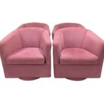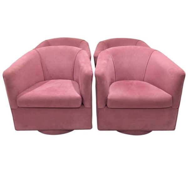 SET OF 4 MATCHING PINK SWIVEL, BARREL ARM CHAIRS WITH A PLATFORM ROUND BASE. THESE HAVE THERE ORIGINAL PINK SUEDE LIKE FABRIC. THE CONDITION IS VERY GOOD WITH A FEW MINOR SPOTS HERE AND THERE. NO ODORS, TEARS OR MAJOR STAINS.