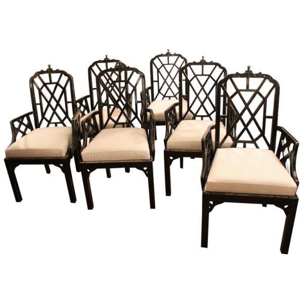 Set of six or 10 Pagoda Chinese Chippendale arm dining chairs. These have there original fabric and will need to be reupholstered. The black lacquer finish is also in need of re-lacquer. These would look amazing in a fresh white lacquer. Structurally sound with no issues to the frames. I also have matching side chairs and a game table available. Perfect for the Hollywood Regency or Palm Beach decor! I have additional arm chairs available if you would like a set of 10 let me know. I also have side chairs available