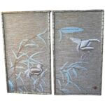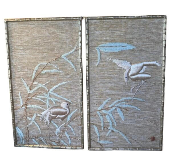 SOLD Don Freedman Pair Wall Tapestry Framed Bamboo Woven Textile Silk Art Pink Birds
