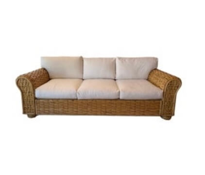 Late 20th Century Ralph Lauren Polo Home Collection woven rattan, wicker sofa. No damage to the woven rattan. The recently upholstered white cushions are in good condition. The only stain I was able to see is on the side of the cushion that is on the end. It cannot be seen unless cushion is removed. Pictured. The cushions have zippers so they can be removed. We have cleaned the wicker frame and had covers cleaned. The sofa will be steam cleaned prior to selling/shipping. The matching loveseat is available separately. The matching cocktail coffee table is also available separately. Dimensions: 29 H (actual back of sofa) x 34 H (height to back of the cushions) x 36 D x 92 W.
