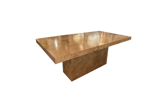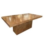 Beautiful Burled Burl Wood Olivewood dining table by Arthur Umanoff for Dillingham. This pedestal table comes with the 2 extension leaves which are housed in the pedestal base. The table closed with no leaves is 72″ L, with both leaves its 108 L. Each leaf is 18″ wide. There is one area on top that has a bit of a bubble, for lack of better words. I tried to picture it but it’s hard to view. It only shows when the light hits it at a certain angle. The bottom corners on floor, pedestal have slight chip, pictured.