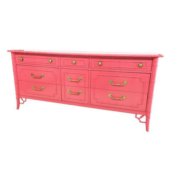 Vintage faux bamboo Thomasville dresser NEWLY lacquered in a coral pink gloss. There may be minor imperfections to the newly lacquered vintage finish.
