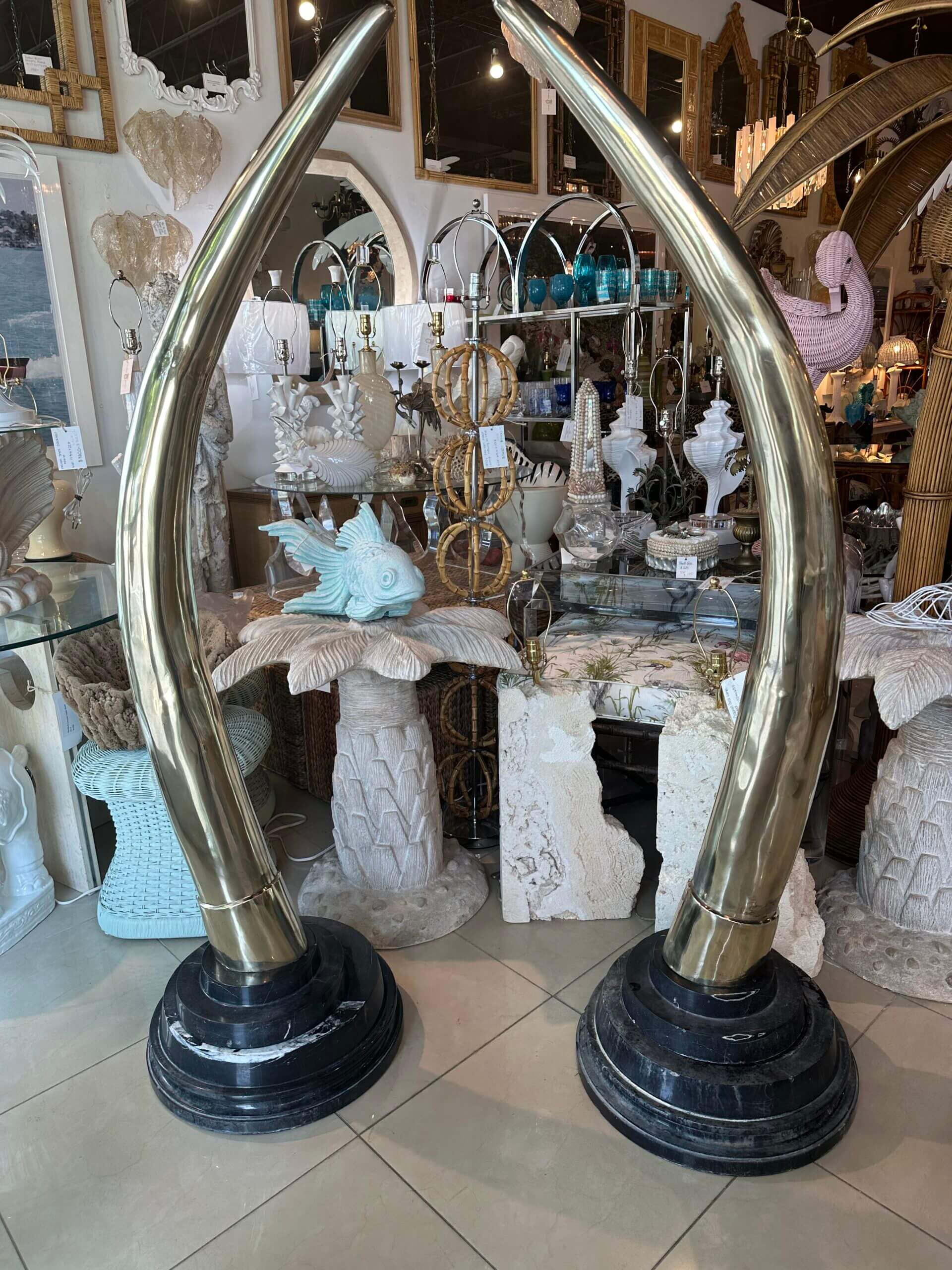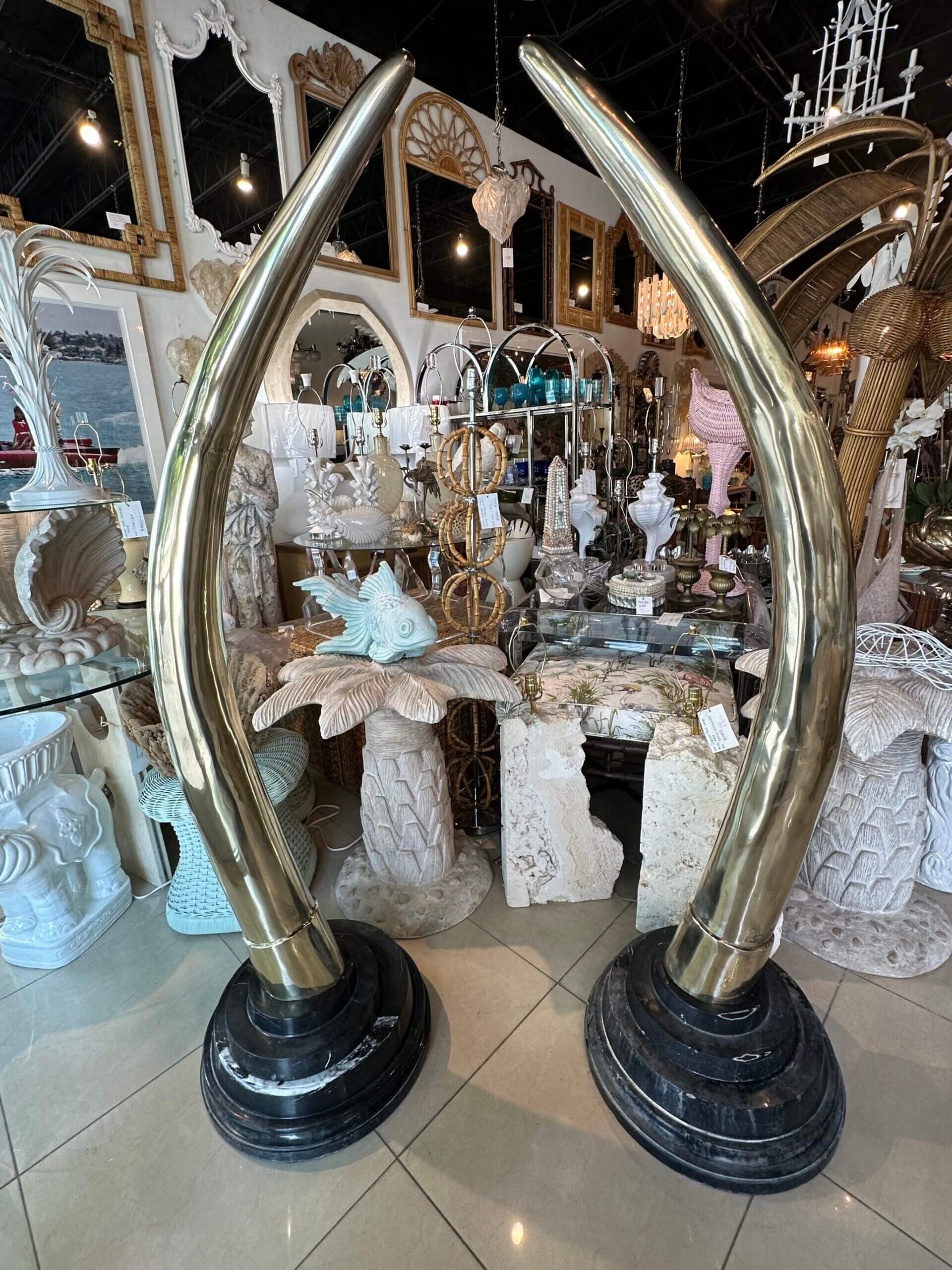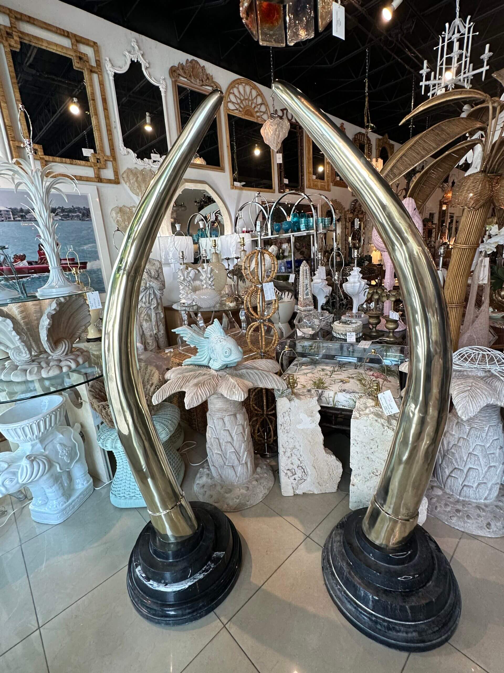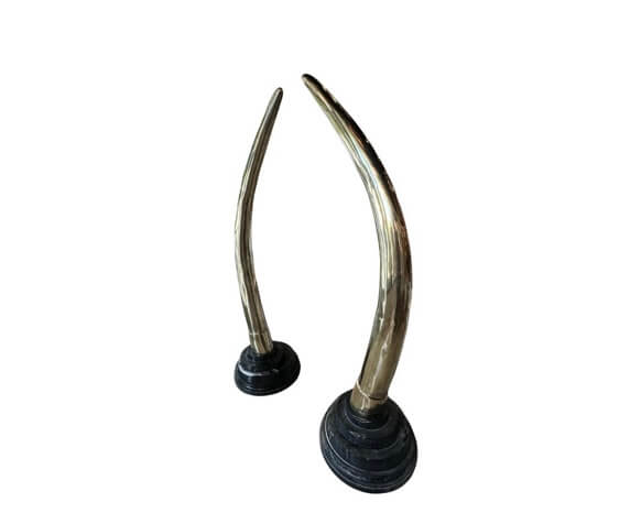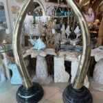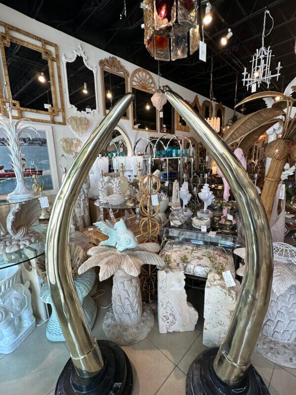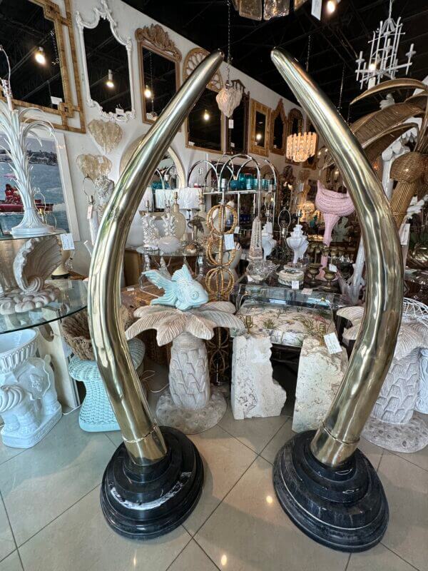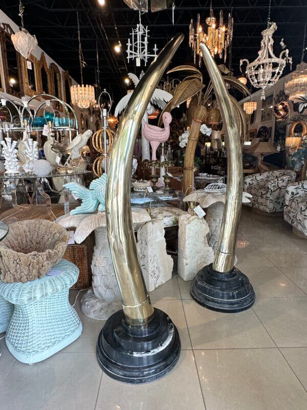 SOLD Vintage Pair 1970s Monumental Brass & Marble Faux Elephant Tusks Life Size