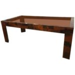 Vintage mixed metals patchwork dining table. Original dark glass top does have scratches. In the style of Paul Evans.