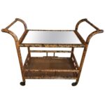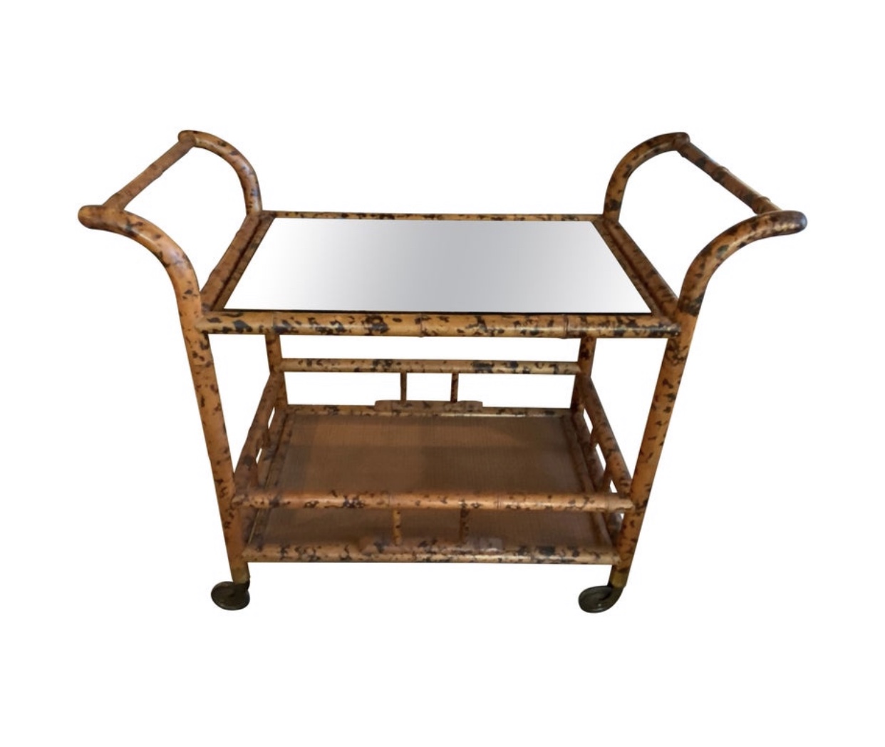 SOLD Vintage Burnt Bamboo Bar Cart Double Shelf Mirror