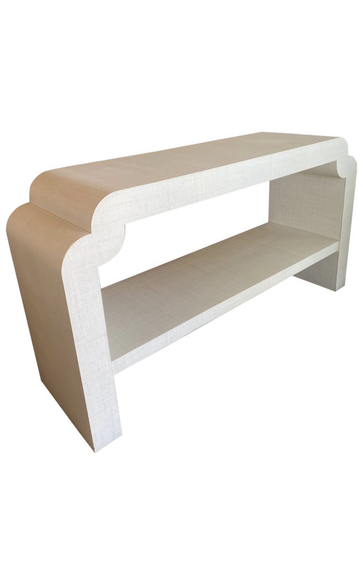SOLD Vintage Curved Grasscloth Linen Cream Console Table with Shelf