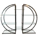 SOLD Vintage Gunmetal Chrome Pair of Curved Etageres Shelves Glass