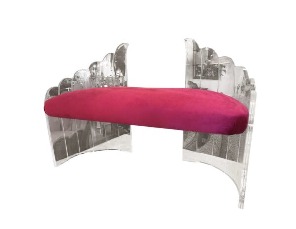 Vintage Lucite bench that has been meticulously restored. The Lucite has been professionally polished. Newly upholstered in a hot pink velvet.