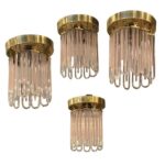 Lovely vintage 1960s Murano, flush mount chandeliers. Brass Top with clear glass and pink u shape drops. These mount to ceiling separately. They can be grouped together or separate. Great powder room, hall, closets, lights. At time of listing there are 4 available. Update: 1 currently available. The listing price is per chandelier.
