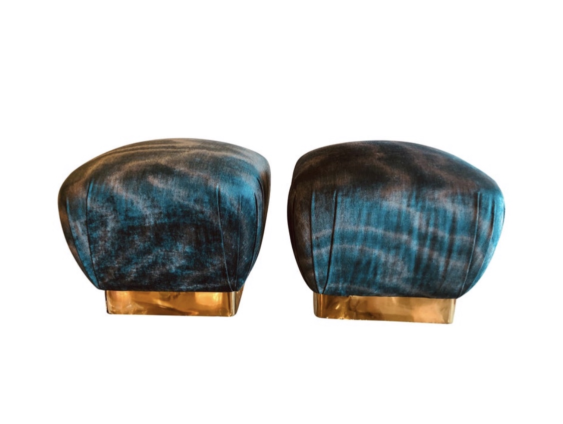 SOLD Vintage Pair Karl Springer Brass Upholstered Velvet Pouf Ottomans Benches